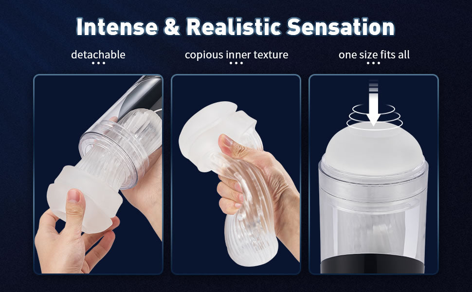 Acmejoy's research shows that deep sucking is the most pleasurable way of stimulation for male users. Optimized for user experience, this suction masturbation cup is our signature product. Its negative pressure air pump can drive the contraction and release of gas, allows the sleeve to simulate the changes of real woman's channel, can bring 5 different and real sucking pleasures. Its inner sleeve is rich in stimulus, bouncy and soft, teases your members with sucking functions. It is softer than the mouth, more memorable than the body! When it sucks, you can put the vibration on. 10 frequencies that caress your sensitive areas from deep, giving you a toe-curling thrill. When you're about to come, just press and hold the boost button, and it will take you to sensual paradise!! Give it a try, you will explode so hard!