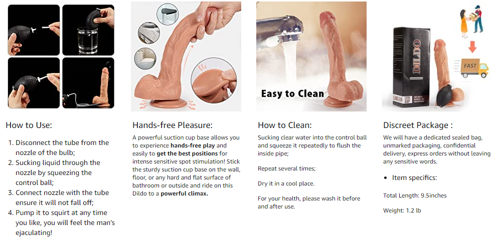 Ascribe to the sturdy suction cup, you can attach this satisfying dildo on a chair. Reaching between your legs, and position yourself above this lifelike but bigger cock, lowering yourself down until feel the head press against your entrance. Relax your shiver legs so the alluring head can slide inside. Insert the whole 9.5” into your lonely body, you will moan loudly with your move and the matchless sensations. As much as you want to savor the thrusting, you are desperate to be filled. So you can squeeze the control ball to feel the warmth hits your uterus, and gives you both physical and emotional satisfaction. Use it for a self masturbation or enjoy with your partner, or strap it into your harness for lesbian sex. This great dildo is all you've ever wanted.